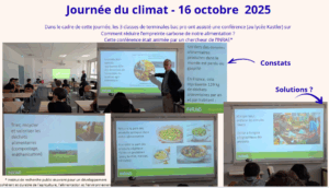 Dans le cadre de la journée du climat, le 16 octobre, les 3 classes de terminales bac pro ont assisté une conférence (au lycée Kastler) sur